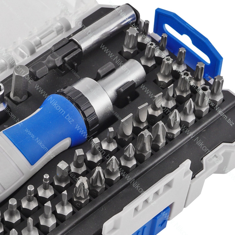 Набор включает трещоточную отвертку и 43 насадки для работы с разными типами крепежа. Компактный штабелируемый кейс облегчает хранение и транспортировку. Набор предназначен для широкого спектра монтажных и ремонтных задач.