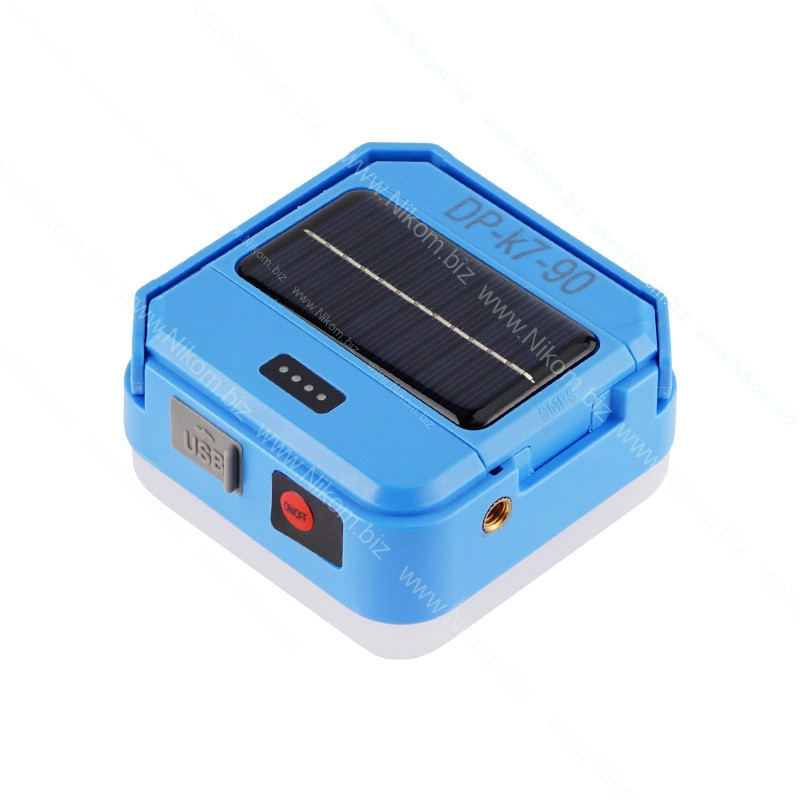 Кемпінговий ліхтар DP-K7-90 призначений для туристичних потреб і працює від двох акумуляторів 18650. Оснащений сонячною панеллю, функцією Power Bank і портом зарядки USB Type-C. Має гачок і можливість кріплення на кронштейн.