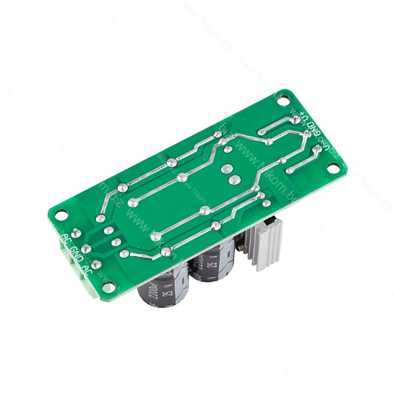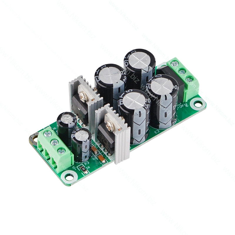 Модуль випрямлення та фільтрації змінного струму призначений для перетворення змінної напруги у стабілізоване двополярне живлення постійного струму. Застосовується для живлення операційних підсилювачів, аналогових модулів, аудіопідсилювачів, вимірювальних приладів і датчиків. Використовує стабілізатори серії 7812/7912, з вбудованим тепловідводом. Забезпечує низький рівень шуму, стабільну роботу та чисте живлення для чутливої електроніки.