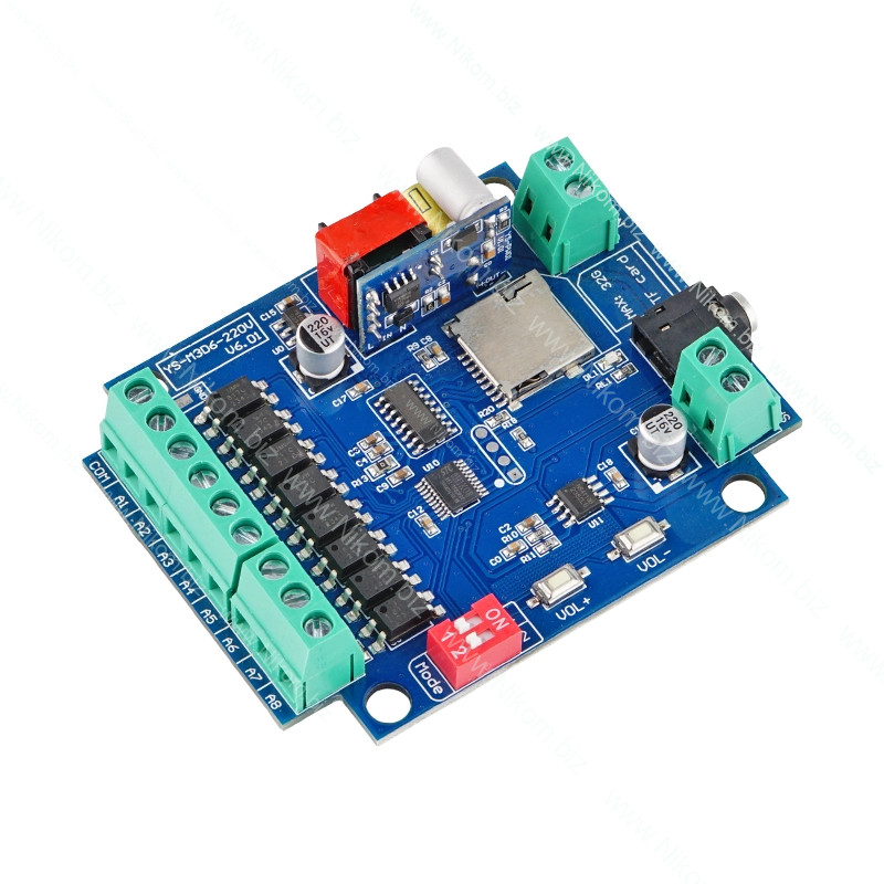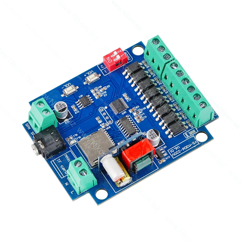 Голосовий модуль YS-M3D6 (версія 220 В) призначений для відтворення до 8 звукових файлів з карти памʼяті microSD при активації відповідних входів. Підключається безпосередньо до мережі 220 В, не потребує зовнішнього живлення. Має аудіовихід 3.5 мм для підключення навушників або підсилювачів і можливість підключення пасивних динаміків. Підтримує вибір режиму відтворення за допомогою DIP-перемикачів, що робить його універсальним рішенням для систем оповіщення, реклами, автоматики та інших проєктів.