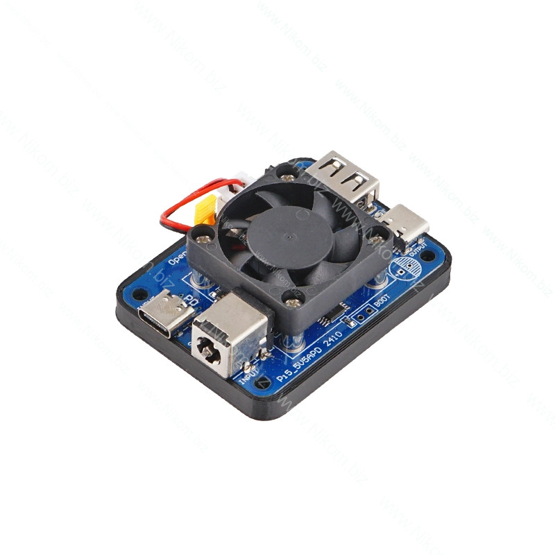 Модуль живлення 5V 5A PD призначений для перетворення напруги з 12 В до стабільних 5 В з максимальним струмом до 5 А. Використовується для живлення одноплатних комп’ютерів, таких як Raspberry Pi 5, Jetson Nano, NanoPi та інших пристроїв з високими вимогами до струму. Оснащений активним охолодженням і підтримкою PD/QC-протоколів.