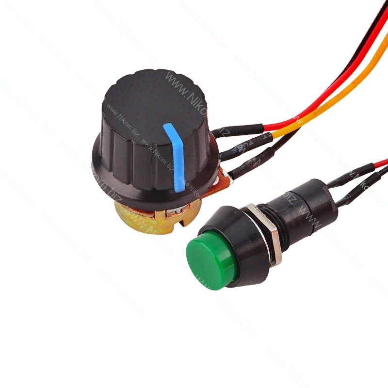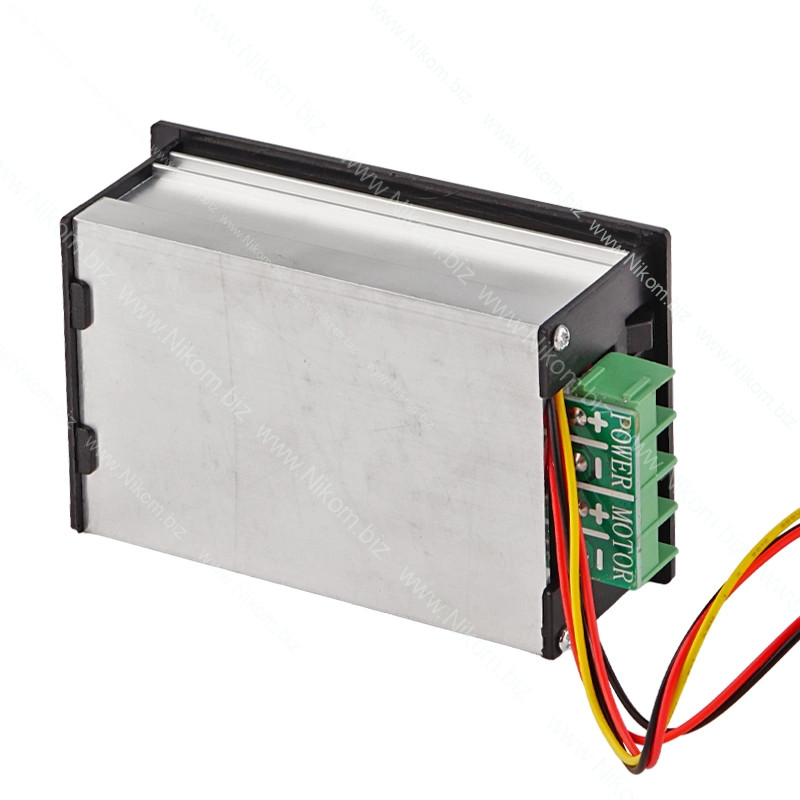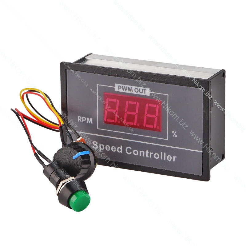 Цифровий PWM-регулятор призначений для плавного керування швидкістю обертання щіткових DC електродвигунів у діапазоні напруги від 6 до 60 В. Оснащений цифровим дисплеєм з індикацією швидкості у відсотках і вбудованим пусковим перемикачем.