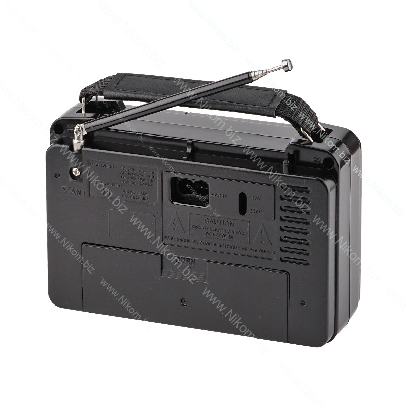 Переносний радіоприймач з підтримкою діапазонів FM, УКХ, СВ, КВ. Оснащений телескопічною антеною довжиною 500мм, аналоговим налаштуванням частоти та можливістю живлення як від мережі 220В, так і від батарейок типу R20.