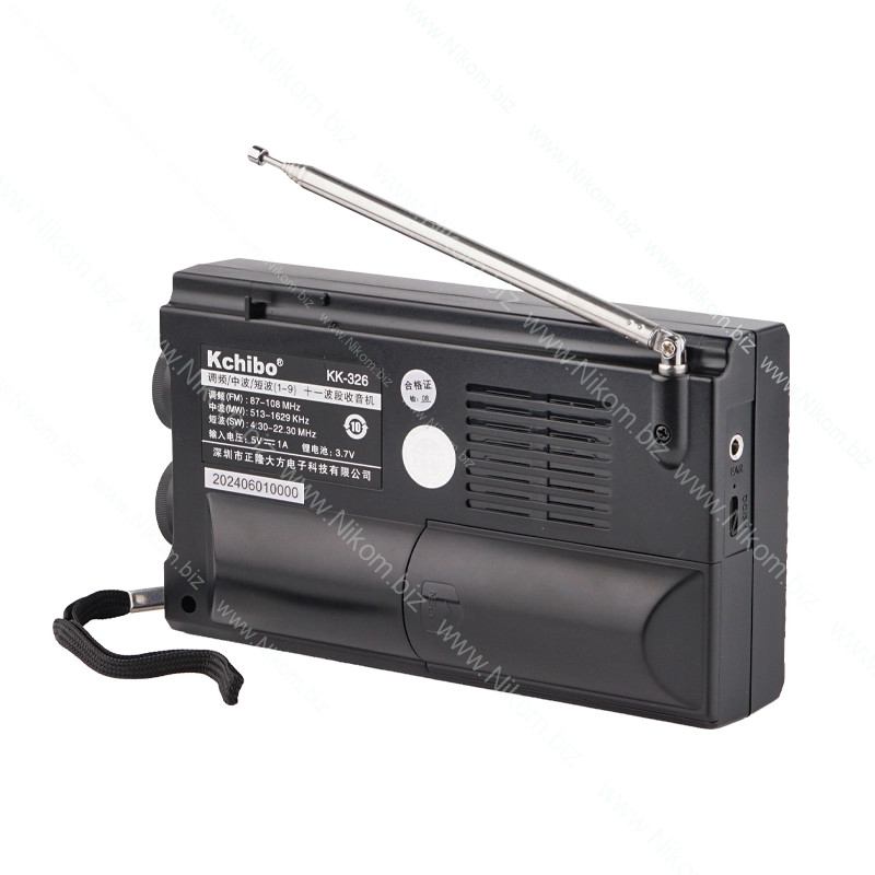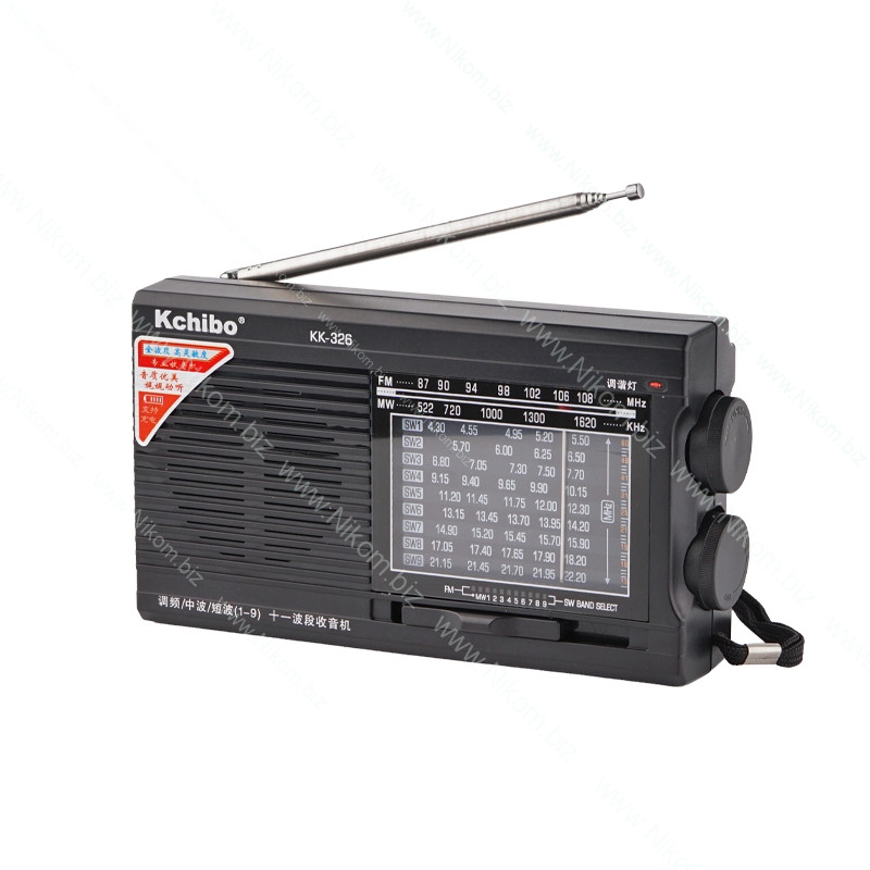 Портативний радіоприймач KK326 призначений для прийому радіостанцій у діапазонах FM, MW та 9 короткохвильових SW. Оснащений чутливою телескопічною антеною та динаміком 57 мм. Працює від акумулятора формату 18650, заряджається через порт USB.