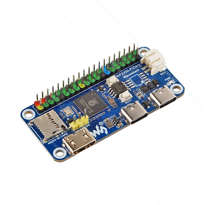 RP2350‑PiZero — це мікроконтролерна плата з високою продуктивністю та широкими можливостями підключення. Оснащена двоядерним процесором з двома архітектурами (ARM Cortex‑M33 та RISC‑V Hazard3), працює на частоті до 150 МГц. Плата має вбудовану пам’ять, що може бути розширена PSRAM, підтримує цифровий відеовихід, читання карток пам’яті та з’єднання через PIO‑USB. Сумісність з Raspberry Pi GPIO робить її зручною для вбудованих та користувацьких рішень.