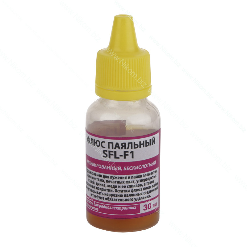 Флюс SFL-F1 предназначен для лужения и пайки элементов радиомонтажа, печатных плат, углеродистых сталей, цинка, меди и ее сплавов, а также оловянных покрытий.