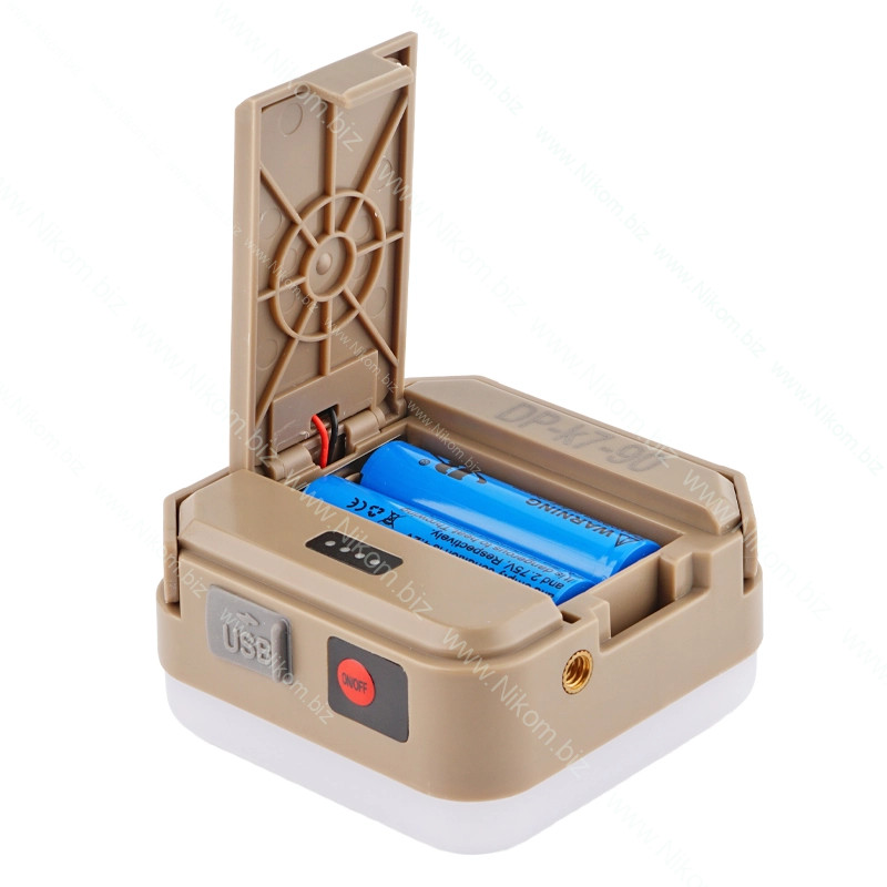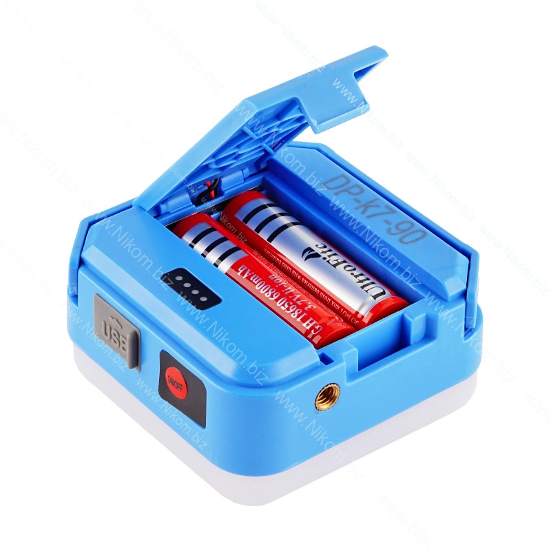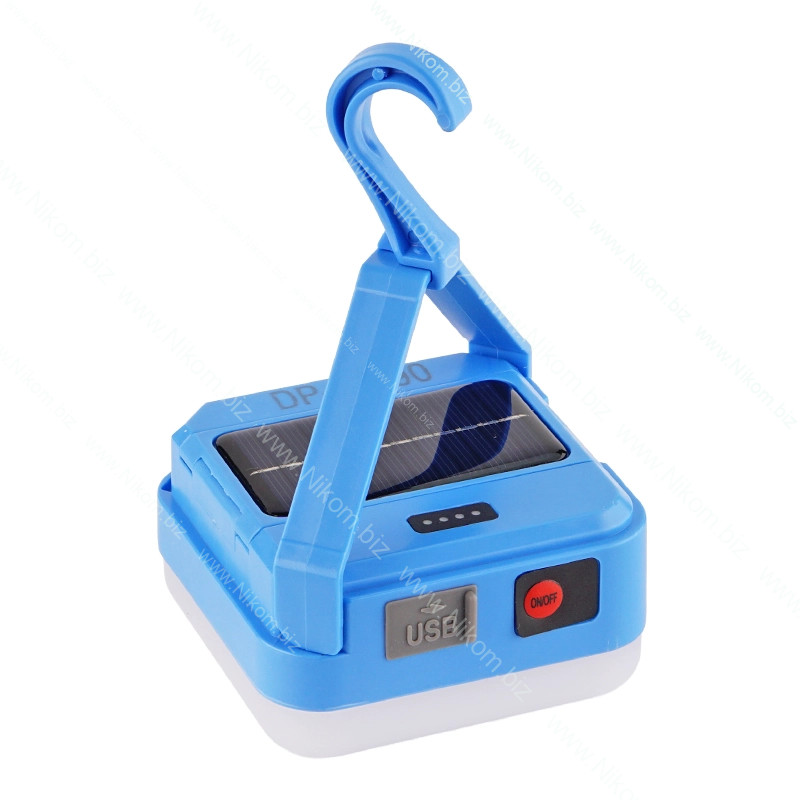 Кемпинговый фонарь DP-K7-90 предназначен для туристических нужд и работает от двух аккумуляторов 18650. Оснащён солнечной панелью, функцией Power Bank и портом зарядки USB Type-C. Имеет крюк и возможность крепления на кронштейн.