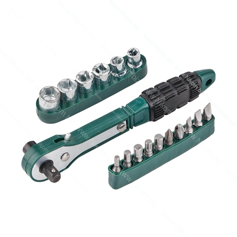 Набор инструментов с трещоткой и насадками 17 в 1 предназначен для выполнения широкого спектра работ по сборке, ремонту и обслуживанию. Включает торцевые головки, крестовые, шлицевые, шестигранные и торцевые биты. Компактный формат и наличие реверсивной трещотки обеспечивают удобство при использовании в ограниченном пространстве.
