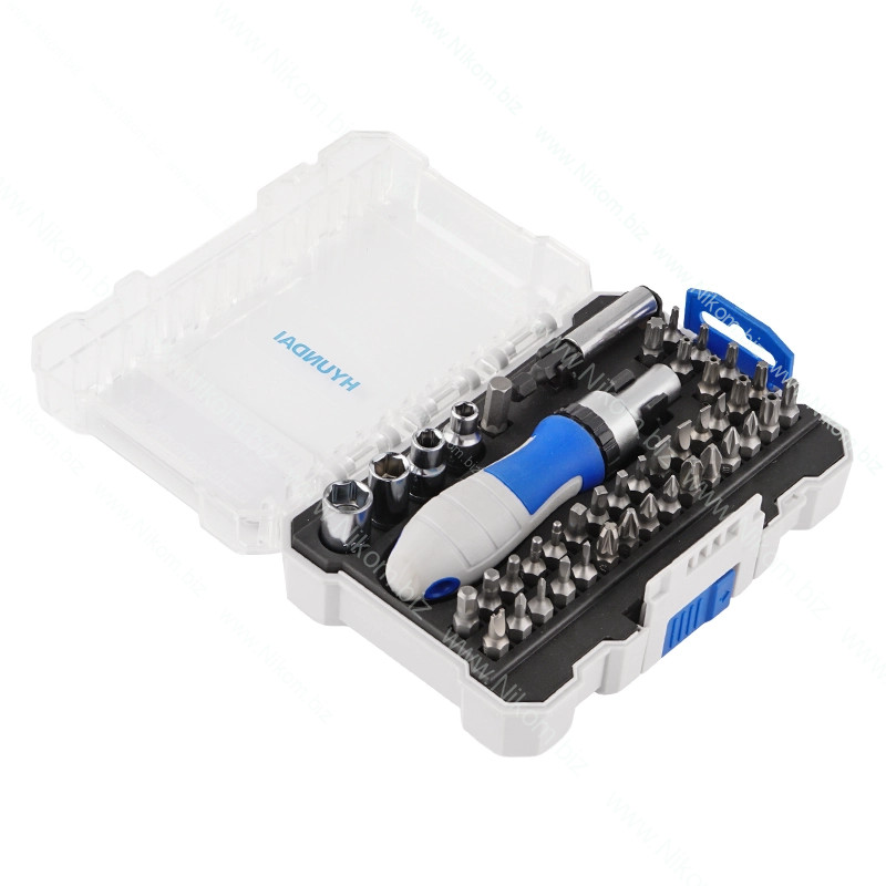Набор включает трещоточную отвертку и 43 насадки для работы с разными типами крепежа. Компактный штабелируемый кейс облегчает хранение и транспортировку. Набор предназначен для широкого спектра монтажных и ремонтных задач.