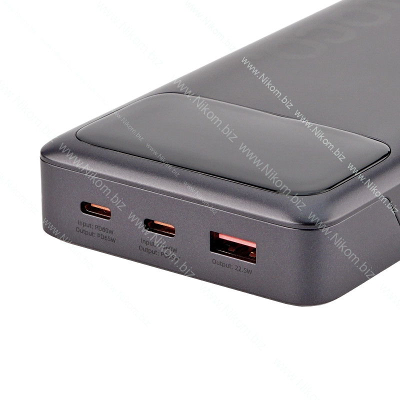 Внешний аккумулятор с ёмкостью 25000 мАч и цифровым дисплеем предназначен для зарядки смартфонов, планшетов, ноутбуков и других устройств. Оснащён двумя выходами USB-C и одним USB-A, поддерживает быструю зарядку до 65 Вт.