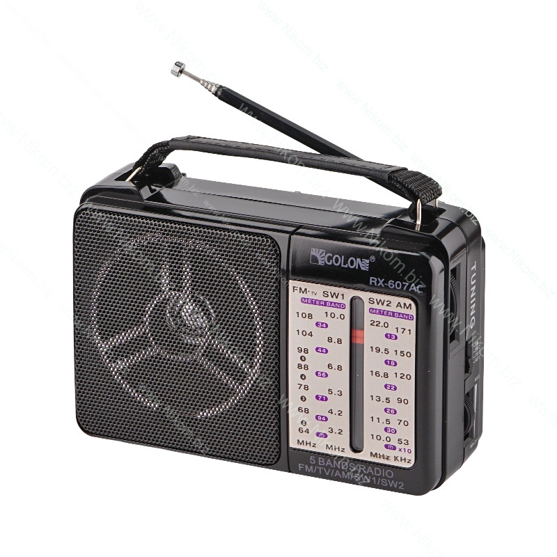 Портативный радиоприёмник с поддержкой диапазонов FM, УКВ, СВ, КВ. Оснащён телескопической антенной длиной 500 мм, аналоговой настройкой частоты и возможностью питания как от сети 220 В, так и от батареек типа R20.