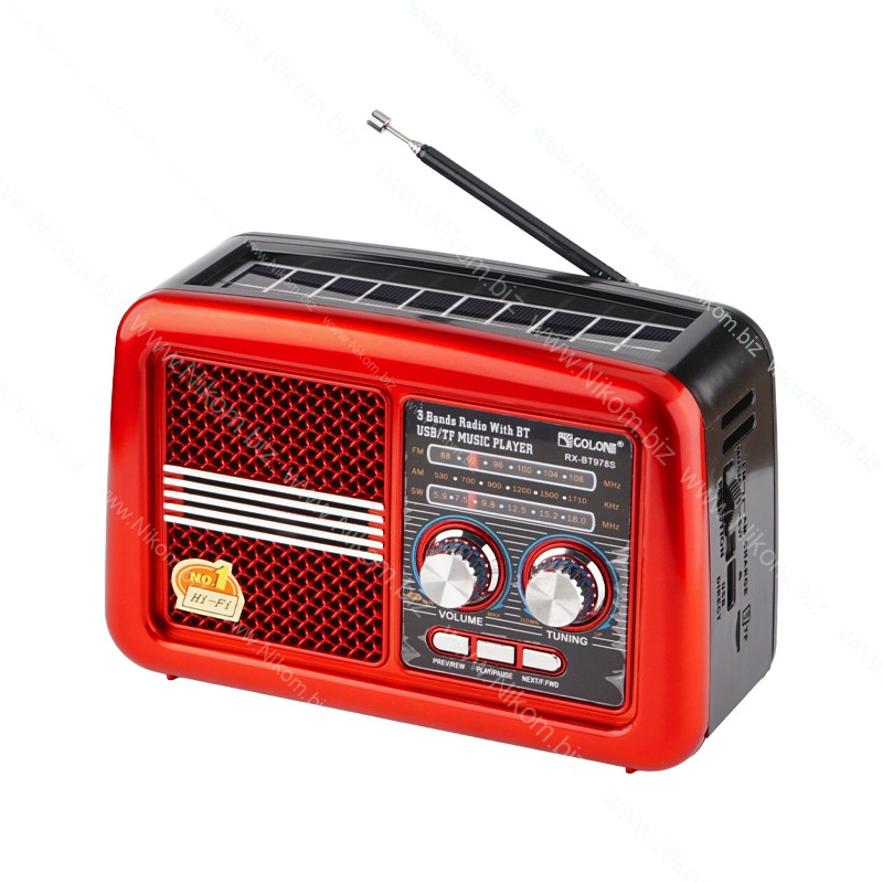Радиоприёмник Golon RX‑BT978S — портативное многофункциональное устройство в ретро‑стиле с поддержкой Bluetooth, MP3, USB и SD/TF, работающее от встроенного аккумулятора, батареек, сети или солнечной панели. Подходит для приёма радиостанций, воспроизведения музыки с носителей или смартфона, а также как переносной медиаплеер с дополнительными возможностями.