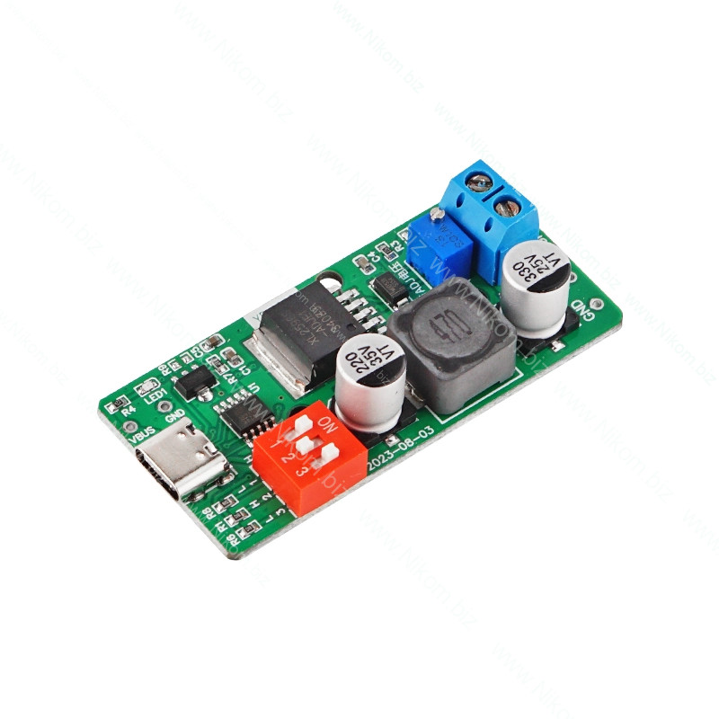 Модуль YR-1008 предназначен для запроса напряжения от USB PD зарядных устройств и адаптеров. Позволяет получать стабилизированное выходное напряжение от 1,8 В до 18 В. Выбор входного напряжения от ЗУ осуществляется переключателями. Выходное напряжение настраивается потенциометром. Оснащён клеммами для подключения нагрузки.
