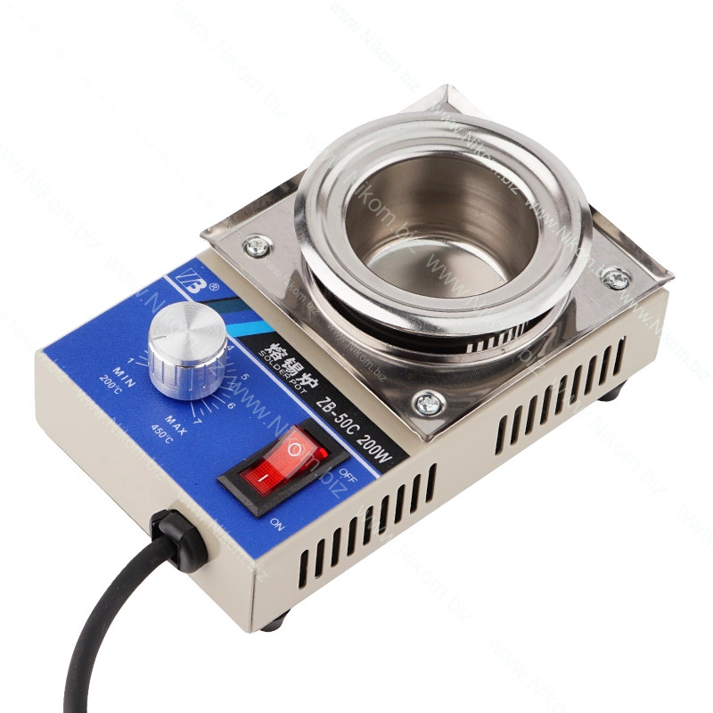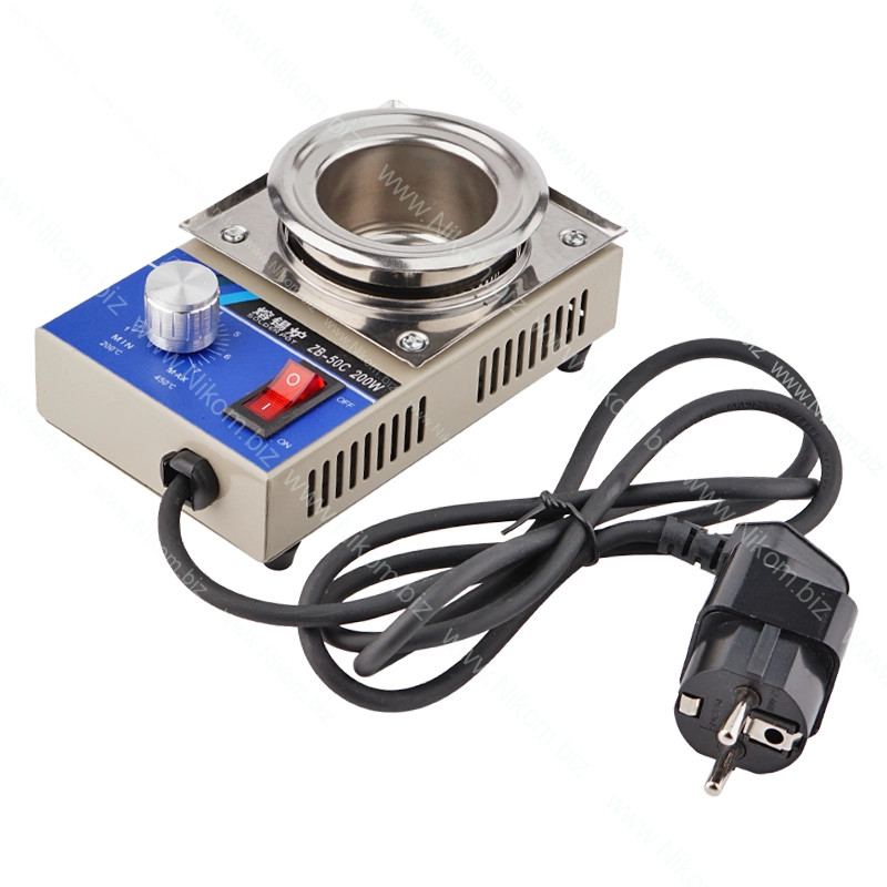 Паяльная ванна ZB-50C предназначена для плавления различных типов припоя, включая оловянно-свинцовые и бессвинцовые сплавы. Оснащена регулятором мощности для настройки температуры в диапазоне от 200°C до 450°C.