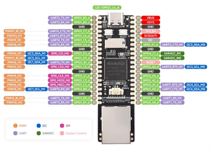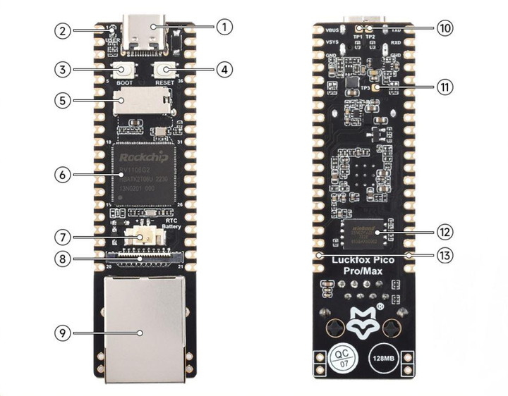 Luckfox Pico Pro — компактная микролинукс-платформа на базе процессора RV1106G2 с 128MB DDR2 памяти. Предназначена для разработки и тестирования встроенных решений. Поддерживает интерфейсы GPIO, UART, SPI, I2C, USB, Ethernet и MIPI CSI, обеспечивая широкие возможности подключения.