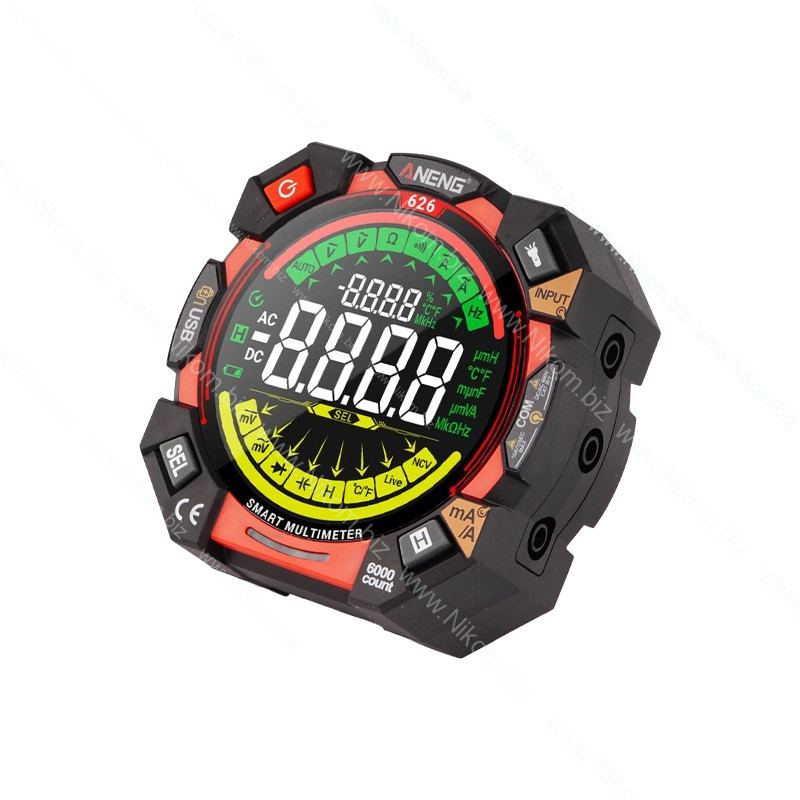 Цифровий мультиметр ANENG 626 призначений для вимірювання напруги, струму, опору, ємності, частоти, температури та інших параметрів. Оснащений великим круглим кольоровим дисплеєм, вбудованим акумулятором і потужним світлодіодним ліхтариком. Підтримує автоматичний і ручний режими вимірювання, а також безконтактне виявлення напруги та провідників.