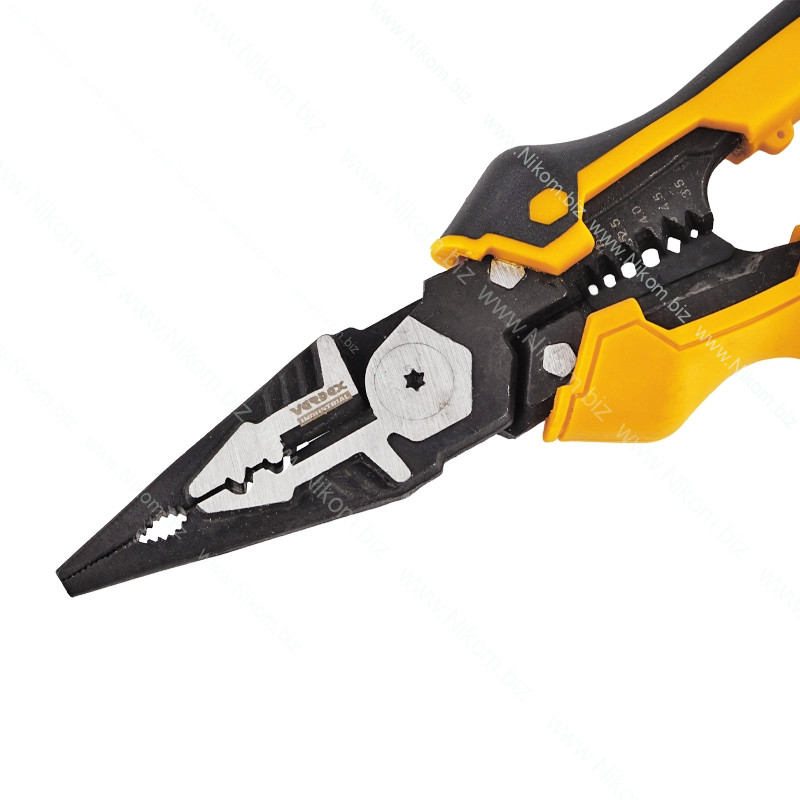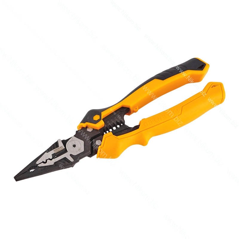 Багатофункціональні плоскогубці 6 в 1 призначені для електромонтажних і побутових робіт. Об’єднують функції захвату, різання, зачистки, обтиску, захвату гайок і фіксації дрібних деталей. Робоча частина — із загартованої сталі з антикорозійним покриттям. Рукоятки двокомпонентні, з ергономічним хватом та пружиною для автоматичного розкриття.