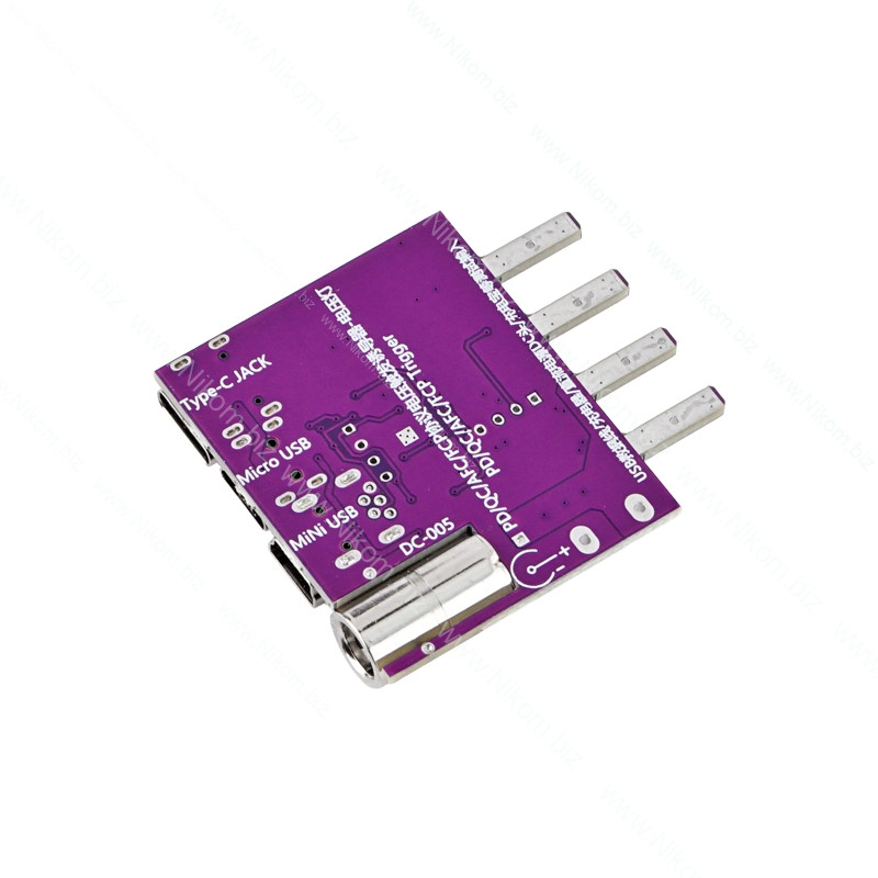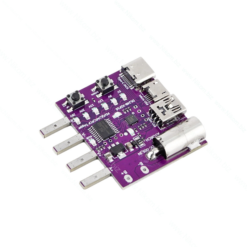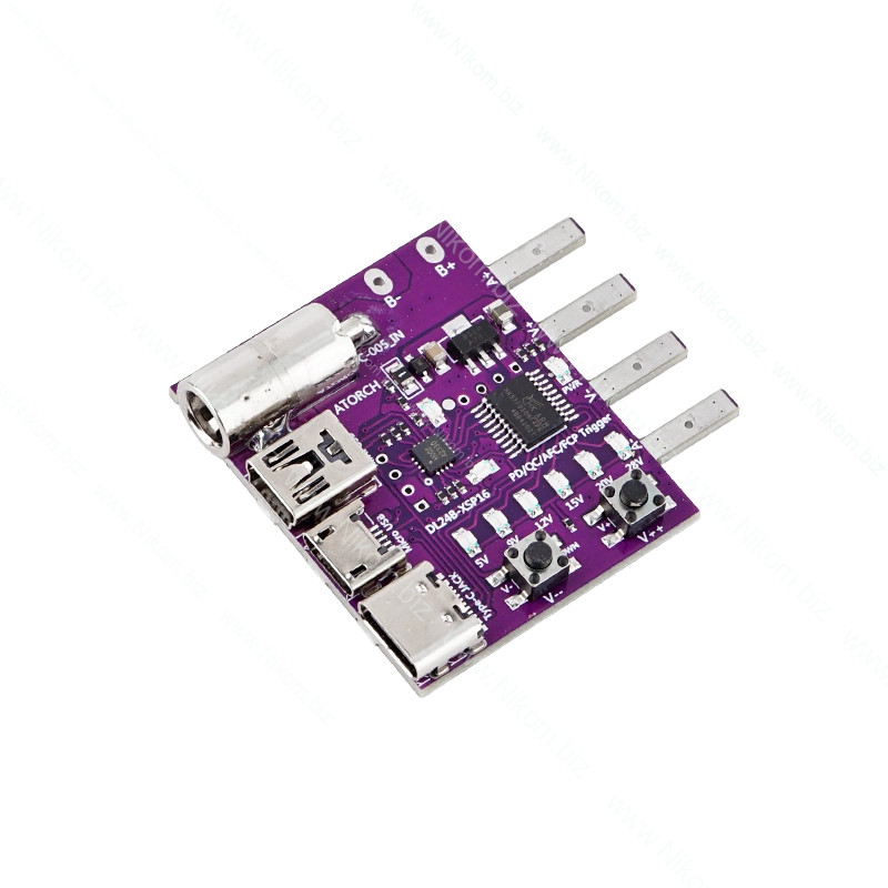 Плата активації протоколів швидкої зарядки DL24B-XSP16 призначена для роботи з електронними навантаженнями та тестування блоків живлення, зарядних пристроїв і кабелів. Виконує узгодження за стандартами PD/QC/AFC/FCP та видає обране напруження на 4-провідний вихід. Керування здійснюється кнопками вибору напруження з індикацією стану; підтримується пам’ять налаштувань при вимкненні живлення.