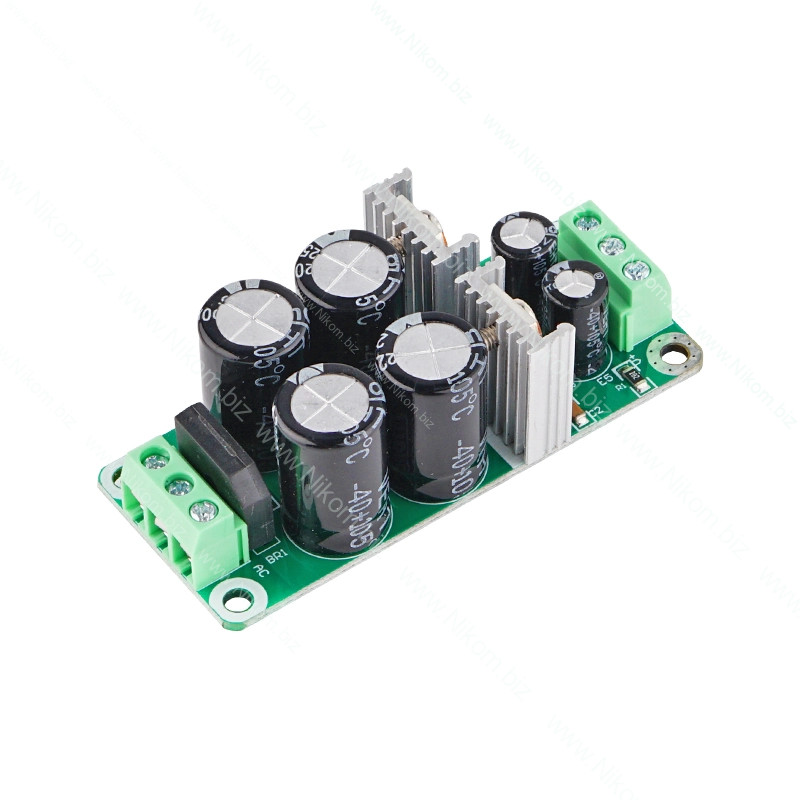 Модуль випрямлення та фільтрації змінного струму призначений для перетворення змінної напруги у стабілізоване двополярне живлення постійного струму. Застосовується для живлення операційних підсилювачів, аналогових модулів, аудіопідсилювачів, вимірювальних приладів і датчиків. Використовує стабілізатори серії 7812/7912, з вбудованим тепловідводом. Забезпечує низький рівень шуму, стабільну роботу та чисте живлення для чутливої електроніки.