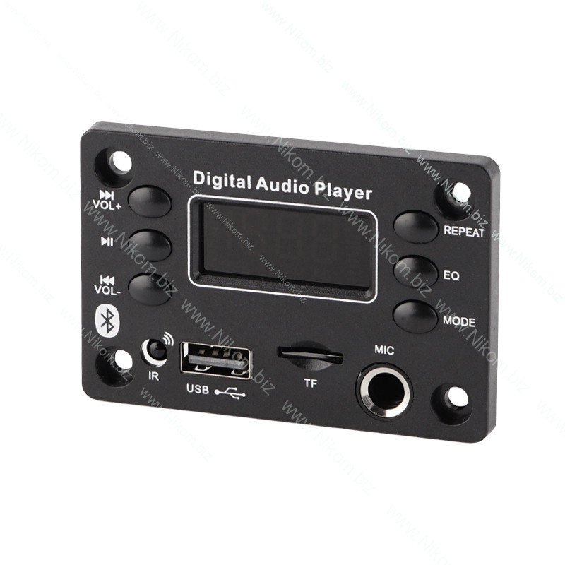 Модуль декодера призначений для відтворення аудіо у форматах MP3, WMA, WAV, FLAC і APE з різних джерел, включаючи USB, TF-карти, Bluetooth та FM-радіо. Оснащений цифровим LED-дисплеєм, інфрачервоним приймачем і підтримує керування з пульта. Даний модуль MP3 можна застосувати як альтернативу автомагнітоли, або встановити музичний центр, бо інший аудіо пристрій. Модуль оснащений USB A роз'ємом, з підтримкою флешки до 32 Гб, TF роз'ємом, для підключення TF не більше 32 Гб.