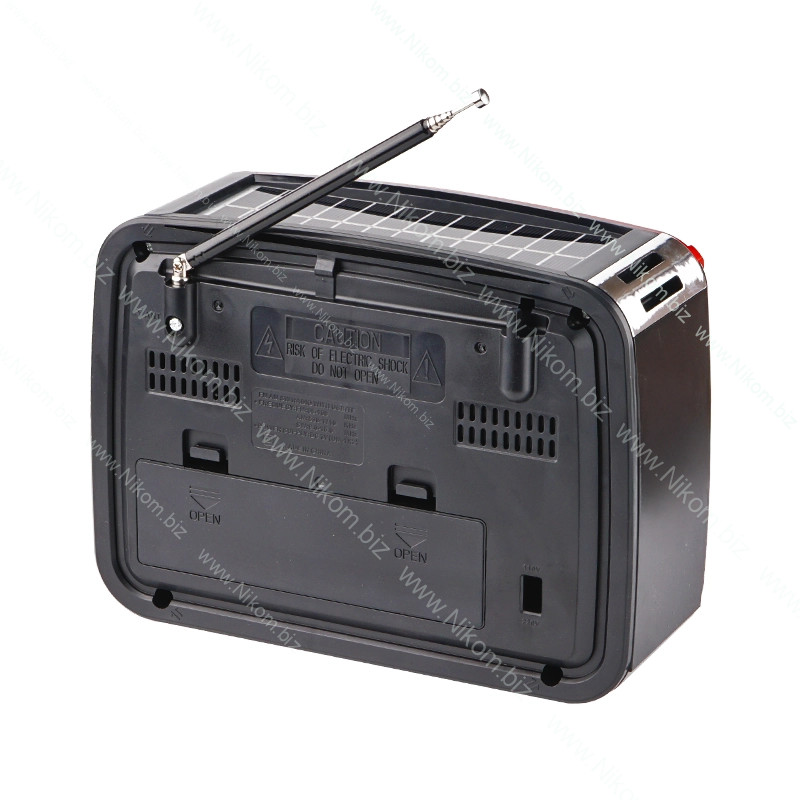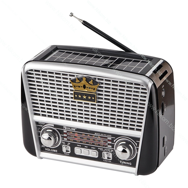 Портативна колонка Golon RX-455S поєднує функції радіоприймача, MP3-плеєра, ліхтарика та павербанка. Оснащена сонячною панеллю для автономного заряджання вбудованого акумулятора. Підтримує відтворення з USB і microSD.