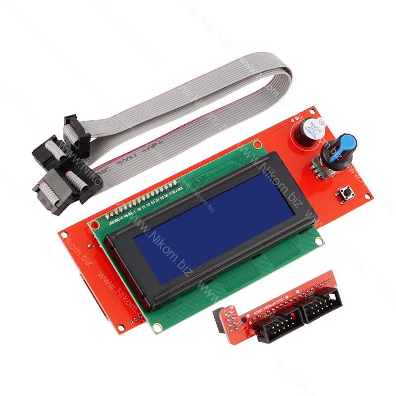 Панель управління RepRapDiscount Smart Controller з символьним дисплеєм 2004A для 3D-принтера або ЧПУ на базі RAMPS. Призначена для автономного керування обладнанням без ПК: зчитування G-коду з SD-карти, навігація по меню та відображення станів. Оснащена енкодером, зумером і кнопкою екстреної зупинки.