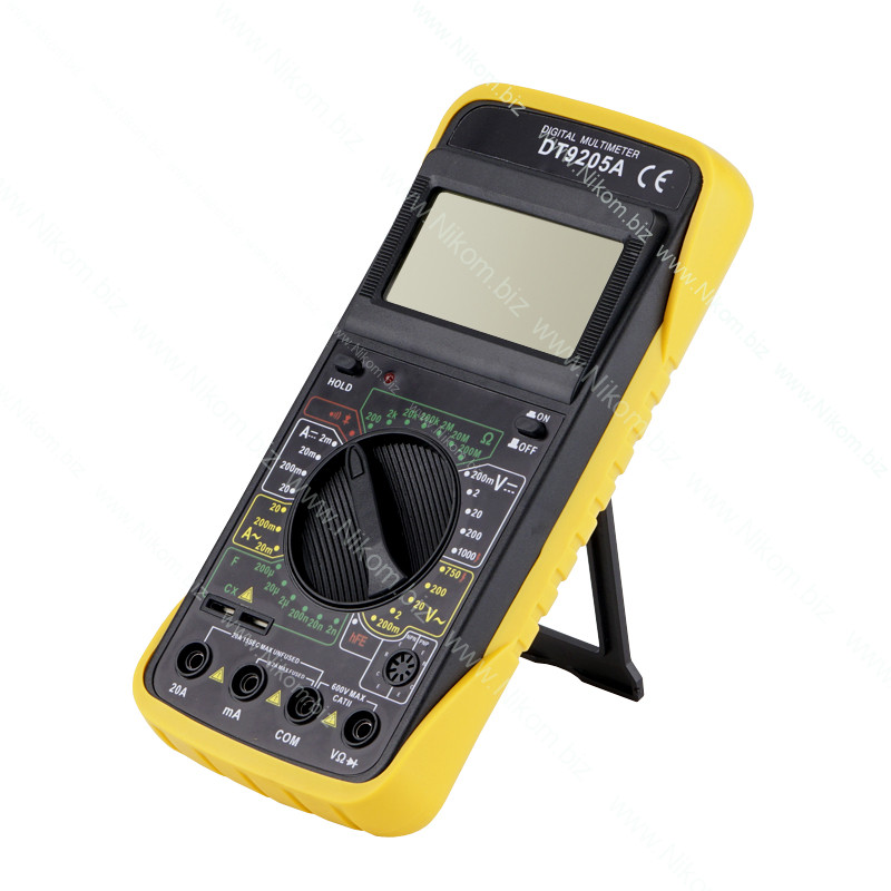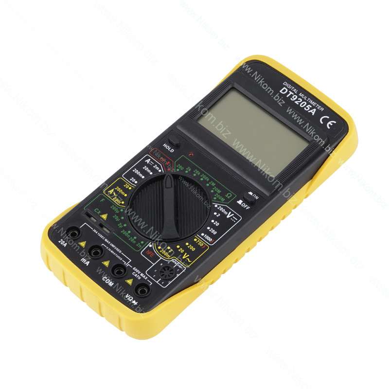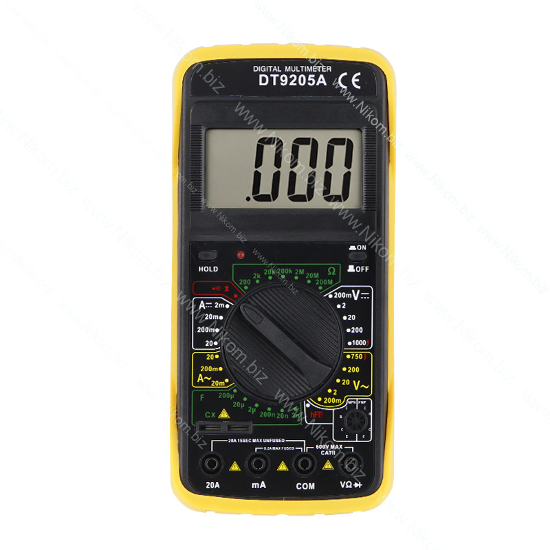 Мультиметр DT9205A — це універсальний прилад для вимірювання основних електричних параметрів: напруги, струму, опору, ємності та частоти. Оснащений функцією утримання даних (Data Hold), звуковим продзвонюванням, тестуванням діодів і транзисторів. Має великий дисплей та ручний вибір діапазонів вимірювань.